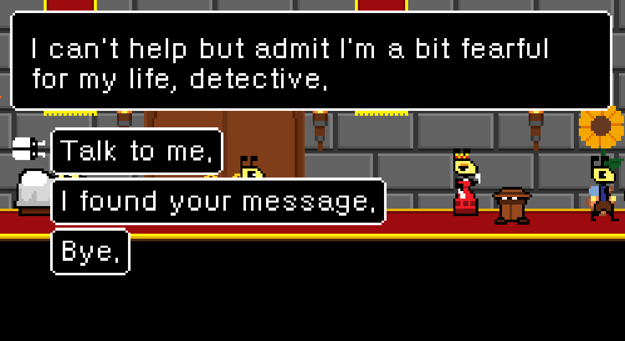 Insective is a game where you take on the role of an Insect Detective (an Insective) who needs to solve a murder in a Bee Kingdom! Explore the Hive, search for clues and help bugs in your journey!